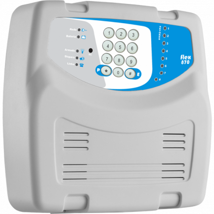 Arma e desarma por controle remoto, senha (teclado) e telefone (chamada originada ou recebida)
